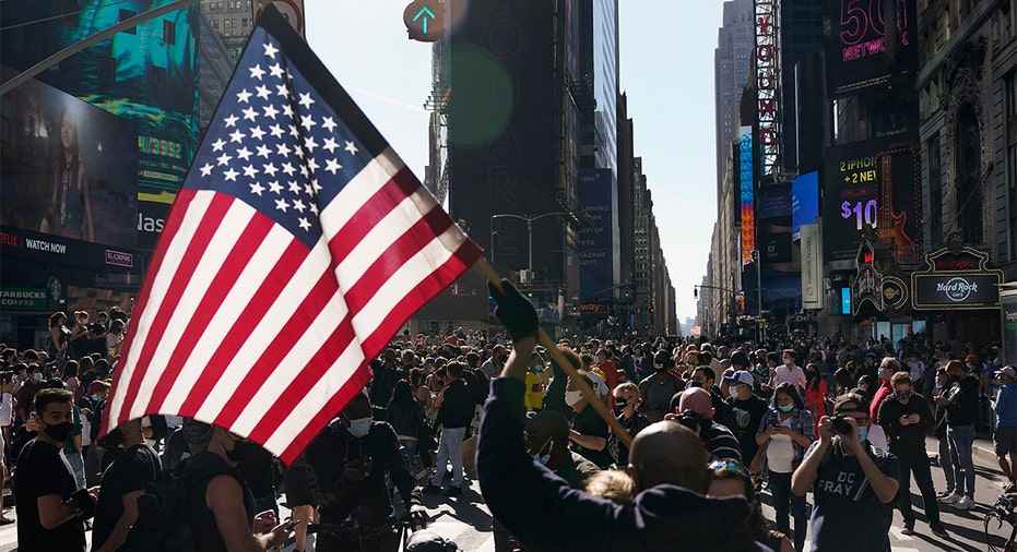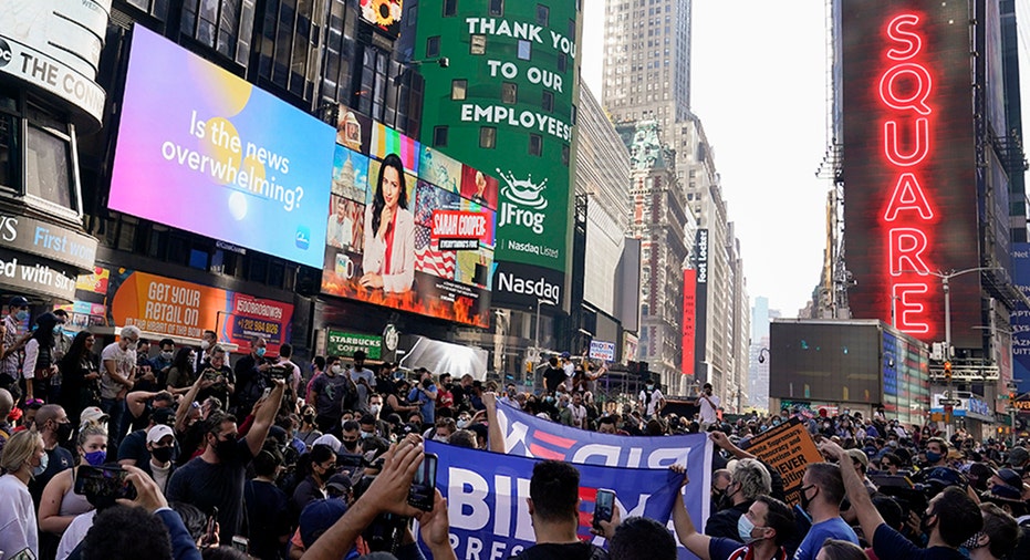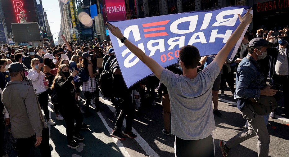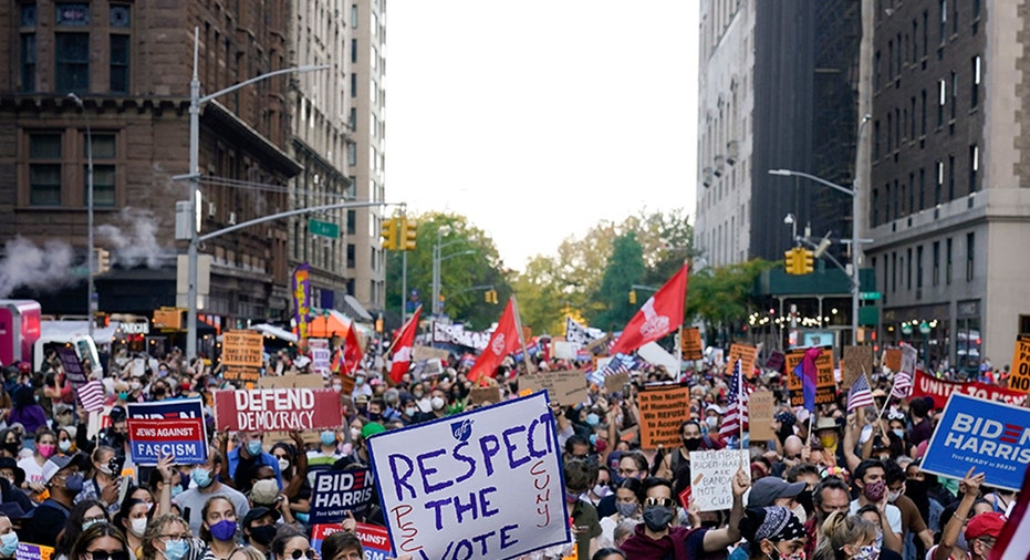Demonstrators march through the streets to advocate protecting the voting results after former vice president and Democratic presidential candidate Joe Biden was announced as the winner over Pres. Donald Trump to become the 46th president of the United States, Saturday, Nov. 7, 2020, in New York. His victory came after more than three days of uncertainty as election officials sorted through a surge of mail-in votes that delayed the processing of some ballots. (AP Photo/Seth Wenig)