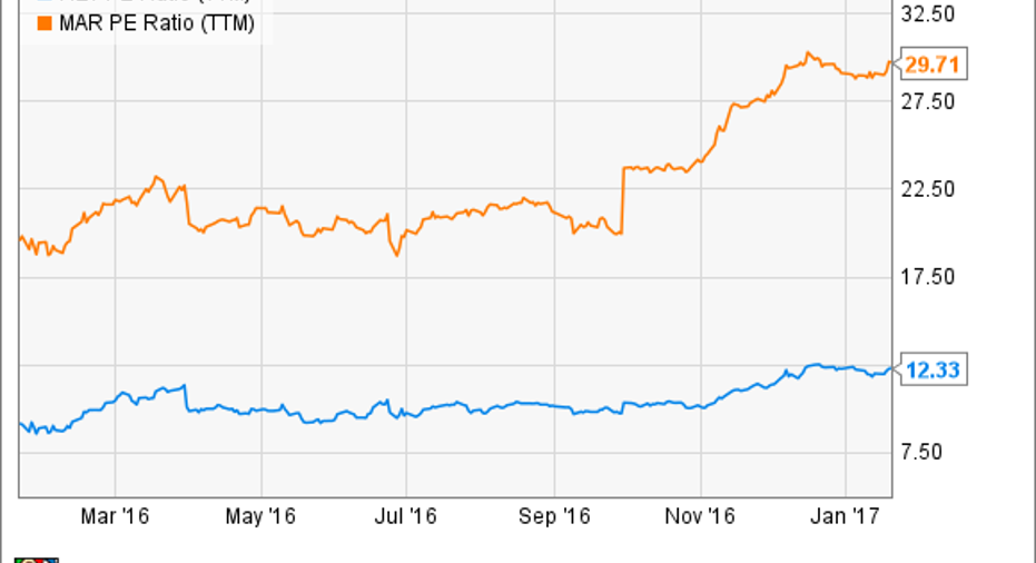 Looking ahead to 2017, Marriott stock runs the risk of being too expensive. After its 2016 run-up, the stock is trading at 30 times earnings, compared to just 12 times for Hilton. If the stock doesn't perform quite as well as expected in one quarter this year, it could get punished.