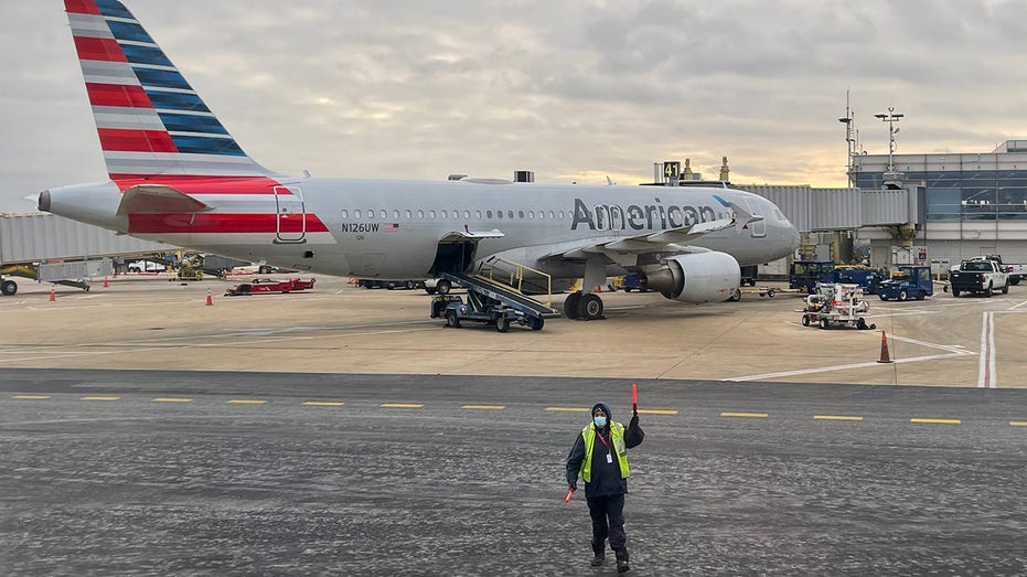 An airport employee gestures on the tarmac as an American Airlines Airbus 220 plane is seen at gate at Washington National Airport (DCA) in Arlington, Virginia on December 18, 2020. (Photo by Daniel SLIM / AFP) (Photo by DANIEL SLIM/AFP via Getty Ima (Daniel SLIM / AFP)
