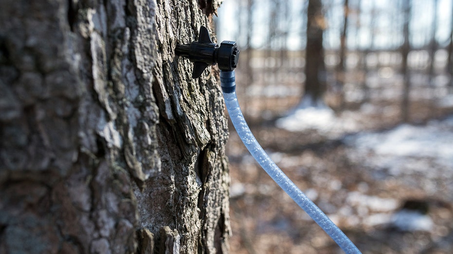 A tube system runs out of a tapped maple tree in the Wagler Maple Products sugarbush in Wessesley, Ontario, Canada (Photographer: James McDonald/Bloomberg via Getty Images) (James McDonald/Bloomberg via Getty Images)