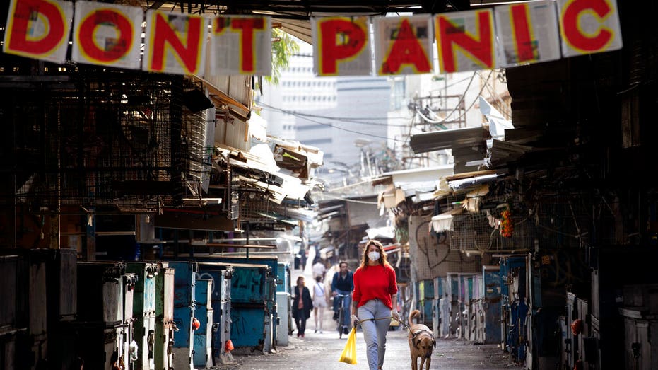 A woman walks her dog under a "don't panic" sign hanging on the entrance of a food market that was shut down in order to reduce the spread of the coronavirus, in Tel Aviv, Israel, Monday, March 23, 2020. (AP Photo/Oded Balilty)