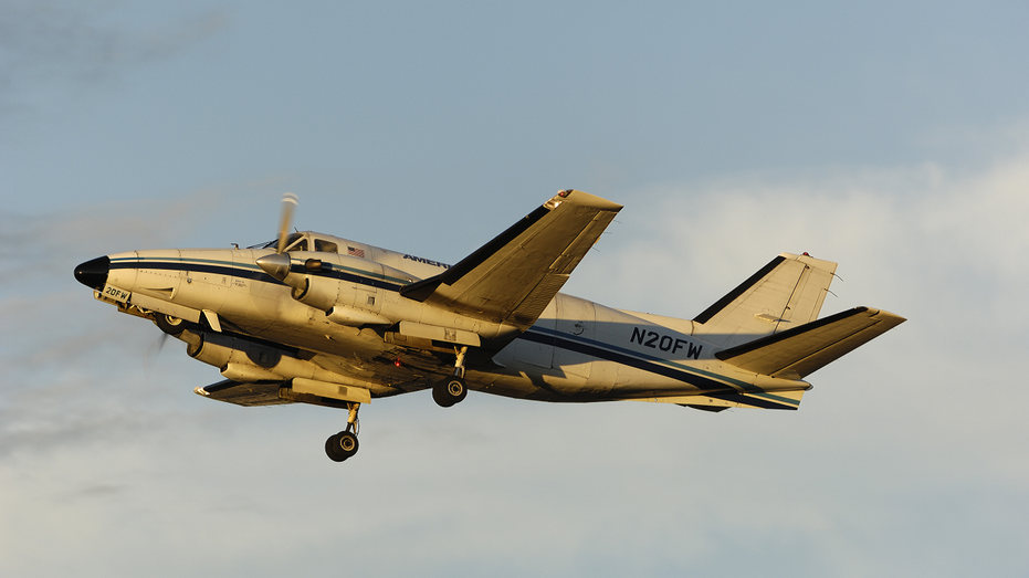 An Ameriflight Beech 99 is seen climbing out after takeoff with its undercarriage retracting. (aviation-images.com/Universal Images Group via Getty Images / Getty Images)