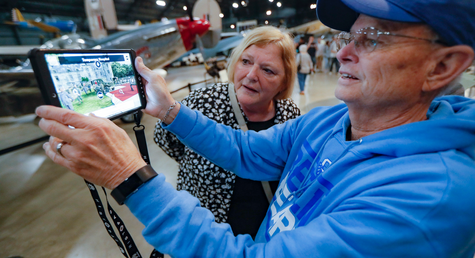 In this Friday, April 26, 2019 photo, Deane Sager, of Louisville, right, and his wife Cathy use a Histopad tablet to view scenes from operations on the western front of World War II at the The National Museum of the U.S. Air Force, in Dayton, Ohio. French-developed technology making its U.S. debut this month will allow new views of the D-Day invasion 75 years ago that began the liberation of France and helped end World War II. The National Museum of the U.S. Air Force near Dayton begins its D-Day commemorations May 13 with military-veteran paratroopers dropping from a vintage plane flying overhead, new exhibits and movies about the June 6, 1944, attack on heavily fortified German positions guarding the coastline. (AP Photo/John Minchillo)