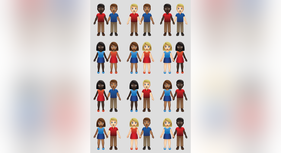 This undated illustration provided by Tinder/Emojination shows new variations of interracial emoji couples. In the world of emojis, interracial couples had virtually no options in terms of skin tone. But the emoji gods, otherwise known as the Unicode Consortium, recently rectified that, approving 71 new variations. Using six skin tones already available for one-person emojis, vendors such as Apple, Google and Microsoft will now be able to offer couples of color. Additions are expected later this year. (Tinder/Emojination via AP)