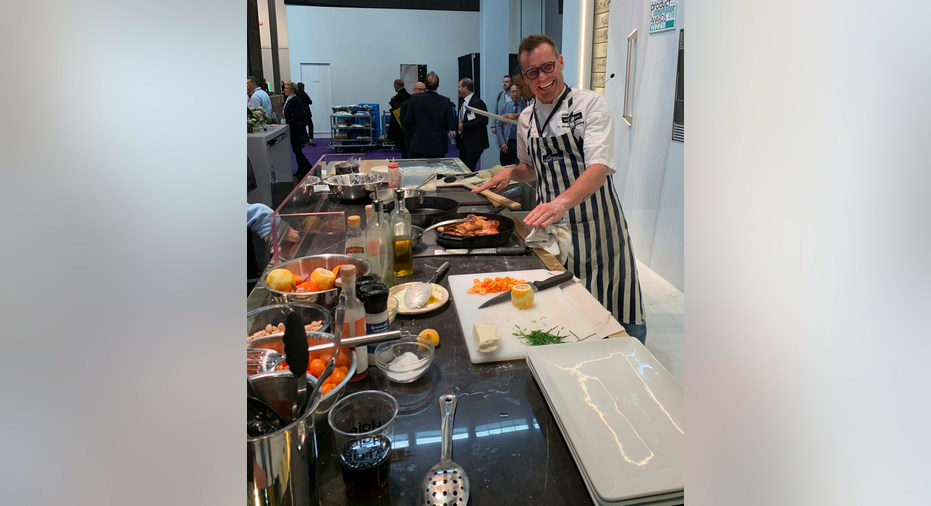 This Feb. 23, 2019 photo shows celebrity chef Brian Malarkey during a cooking demonstration at the GE Appliance display during the Design and Construction Week show in Las Vegas. The chef, a Food Network judge, said he likes the precision of an induction cooktop. (Karen Schwartz via AP)
