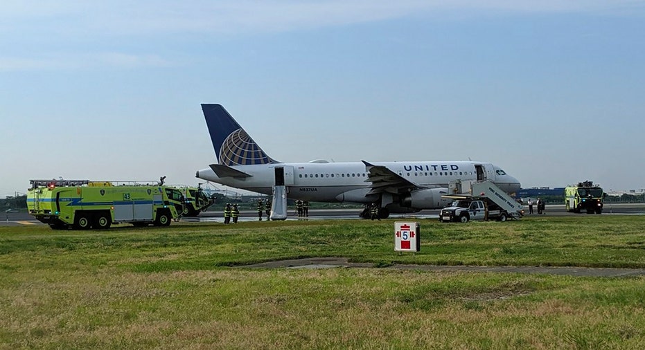 AUnited flight sitting on the runway after making an emergency landing, Saturday, June 29, 2019 at Newark Liberty Airport in Newark, N.J. (John Murray via AP)