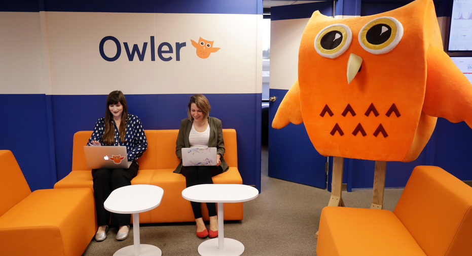Fowler shopped at Ikea for desks. The walls are painted in the company's brand color, orange, and there's a huge owl — a cloth representation that can be worn as a costume for Owler staff events and photos — at the office entrance.