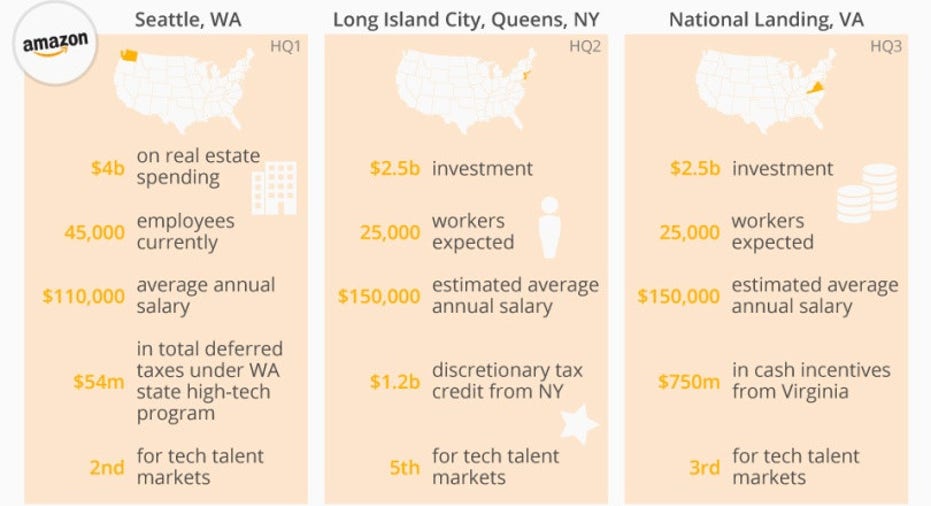 The best indication of Amazon's impact on a large urban community—both benefits and drawbacks—is to look at the one Amazon has already occupied for decades. Statista aggregated data from Amazon and news reports on how each HQ location stacks up in terms of investment, employees, salary, tech recruiting talent, and of course, tax breaks.