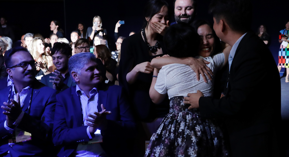 Members of Kitkit School embrace after winning the XPRIZE for Children's Literacy, Wednesday, May 15, 2019, in Los Angeles. (AP Photo/Marcio Jose Sanchez)