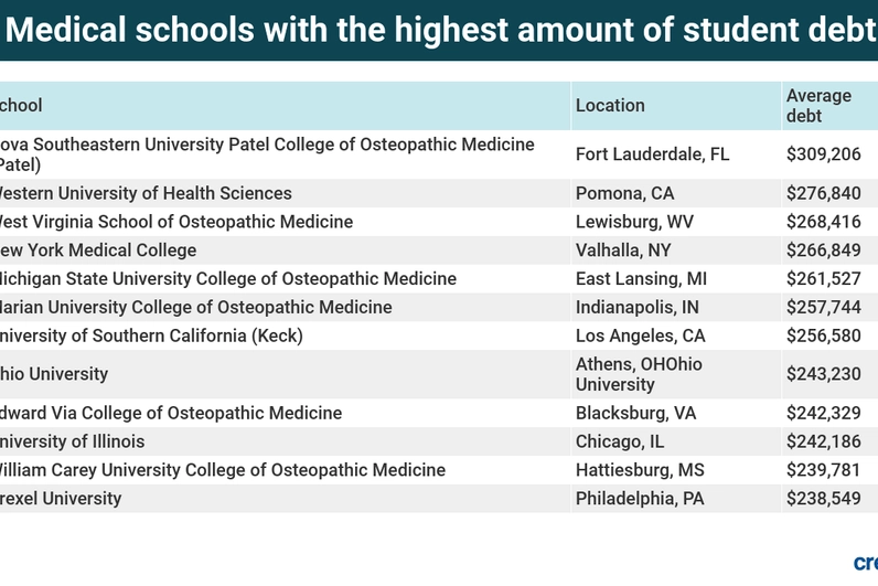 Graduates from these 12 medical schools had the highest amount of student loan debt in the U.S., according to 2022 data from U.S. News and World Report.