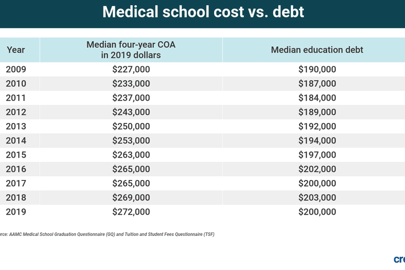 The average debt for medical school graduates increased at a clip of 2.3% per year from 2009 to 2019 — a rate which eclipsed the 1.7% annual Consumer Price Index inflation rate during that period, according to the AAMC.