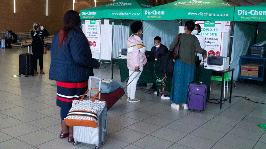 Passengers queue to get a PCR test against the coronavirus disease (COVID-19) before traveling on international flights, at O.R. Tambo International Airport in Johannesburg, South Africa, November 26, 2021. REUTERS/Sumaya Hisham (REUTERS/Sumaya Hisham / Reuters Photos)