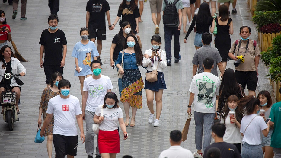 People wearing face masks to protect against the coronavirus walk through an outdoor shopping area in Beijing, Saturday, July 25, 2020. (AP Photo/Mark Schiefelbein)
