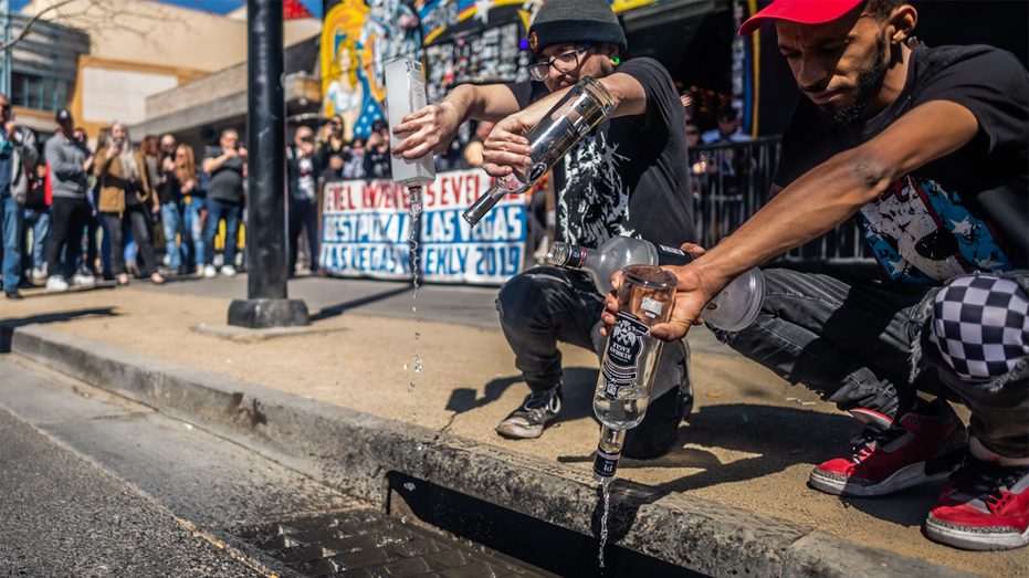 Bartenders from Evel Pie pour Russian vodka down the drain in downtown Las Vegas. (Evel Pie)