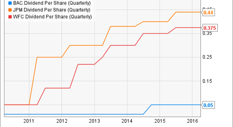 The net result is that Bank of America's current dividend payout ratio, which measures the percentage of net income distributed via dividends, is only 16%, according to Yahoo!Finance. That's less than half of many of its peers. Wells Fargo'spayout ratio, for example, is 37%, while JPMorgan Chase'sis 30%.