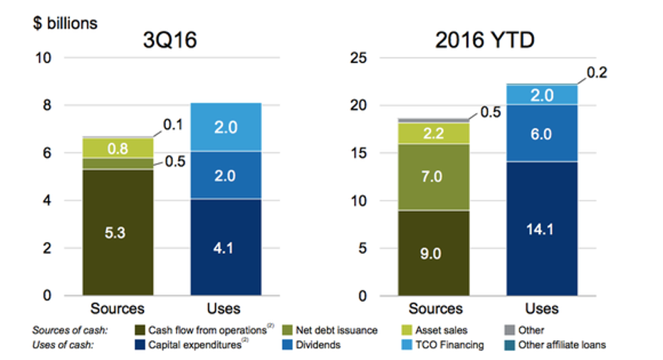Chevron spent $14 billion on capital expenditures through the first nine months of 2016, way more than the cashflow it is generating. The problem that Chevron faces is that there's a finite amount of oil in its reserve base. Every barrel it pulls out of the ground has to be replaced or the company risks eventually running out of oil to drill for. In other words, it just can't stop exploring and developing new sources of oil and gas, it's a key part of the business model.