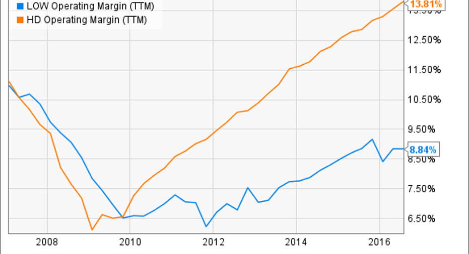This is another long-term trend that separates the two retailers from each other. Since the bottom of the housing market crisis, Home Depot's operating margin has more than doubled while that of Lowe's has barely improved.