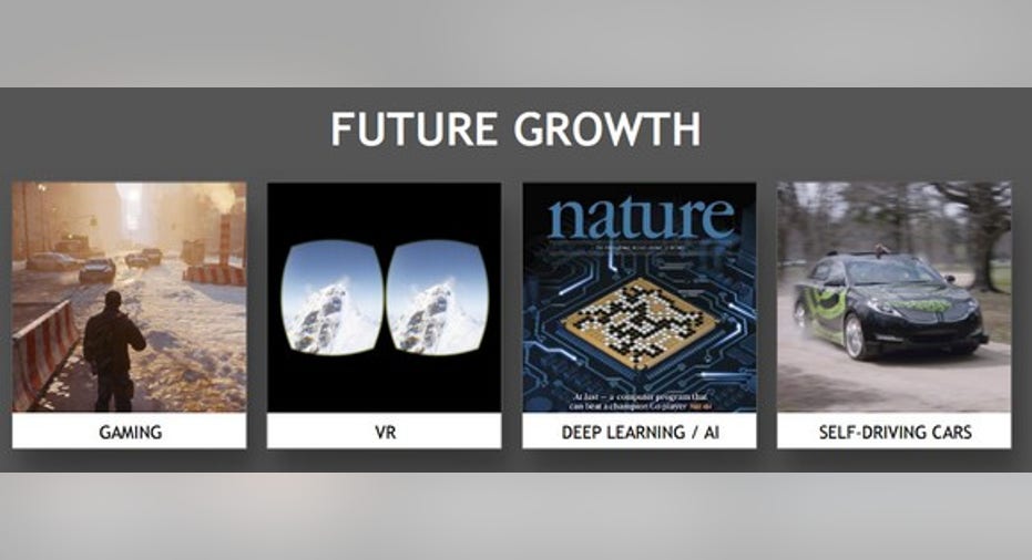 Given this financial performance, it's not surprising that NVIDIA was the best-performing stock on the S&P 500 in 2016 with its 227% total return. While shares have taken a breather in 2017 -- they're down 2.7% -- they've still returned a whopping 194% for the one-year period through May 4, versus the broader market's 18.3%.