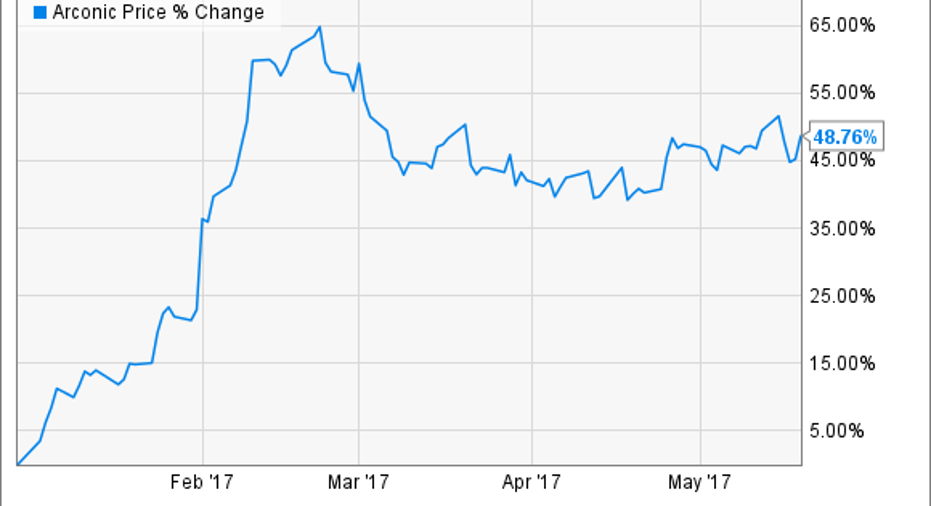 The automotive market has been a key driver for Arconic in recent years as automakers increasingly turn to lightweight aluminum frames and parts, which add strength at a lighter weight than steel and improve fuel efficiency. In fact, automotive revenue increased 33% year over year during the first quarter of 2017 -- leaping to the third-largest market for the company. It was responsible for $58 million, or 13%, of the period's sales.