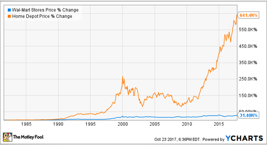 Jeremy Bowman (Home Depot): Wal-Mart is the world's biggest retailer and the most valuable brick-and-mortar chain in the world. The Bentonville behemoth has also put up incredible returns: Since its debut in 1970, the stock has returned more than 120,000%. But one retailer has consistently outperformed throughout modern history, and that's Home Depot.