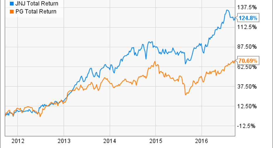 Johnson & Johnson may not pay as meaty a yield as P&G right now (2.7% vs. 3%), but that's partly because the stock is up so sharply. Shares have more than doubled over the last five years including dividend reinvestments, compared to a market-lagging 71% rise for P&G.