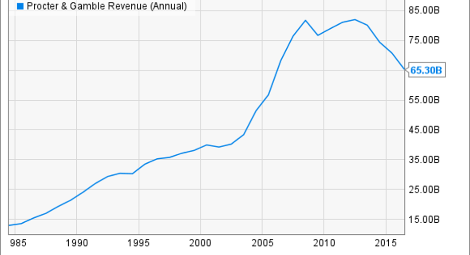 Annual revenue has declined sharply in each of the last two years. In fact, fiscal 2016 marked P&G's lowest sales point since 2006.