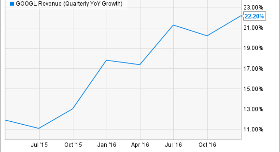 Going into 2017, Alphabet will be up against a strong benchmark: itself. With a tough year-over-year comparison of 20% revenue growth in 2016, the company will need to continue executing well across Google advertising and YouTube, as well as its smaller businesses like hardware and cloud. Further, while Alphabet's other bets are still too small to help overall revenue growth in 2017, investors should continue to look for promising signs from the segment this year.