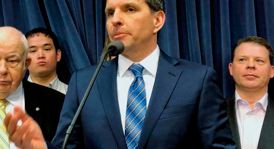 Mike Monseur, owner of Godfather's Pizza and Dew Chilli Parlor in Springfield, Ill., speaks in the state Capitol in Springfield, Ill., Tuesday, Feb. 11, 2019. Nearly a quarter of workers in Illinois would see their pay almost double under a proposal nearing final approval in the Legislature, but inflation will take a huge bite by the time the state's minimum wage reaches $15 an hour in 2025. (AP Photo/John O'Connor)
