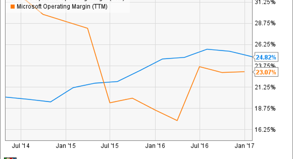 Hardware is generally a less profitable business than software, and Microsoft's operating margin was once much higher than Cisco's. However, Microsoft's higher investments in cloud growth, the writedowns on its mobile business, and its use of free software to gain more users have taken a toll on operating margin. Meanwhile, Cisco's shift away from hardware toward more software services such as security and collaboration enabled it to gradually post a higher operating margin than Microsoft.
