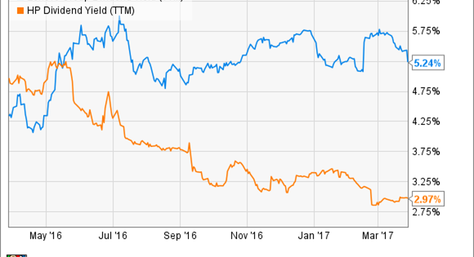 At first glance, Lenovo's trailing yield of 5.2% looks much better than HP's 3% yield. However, Lenovo's yield was lifted to an all-time high by the stock's 17% decline over the past year.