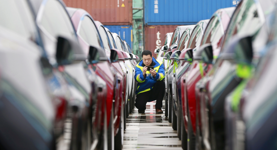 In this Feb. 22, 2019, photo, a port worker works among one of the first batches of Tesla Model 3 electric cars to be delivered to China at a port in Shanghai. In an unusual step, China’s ceremonial legislature is due to endorse a law meant to help end a bruising tariff war with Washington by discouraging officials from pressuring foreign companies to hand over technology. (Chinatopix via AP)
