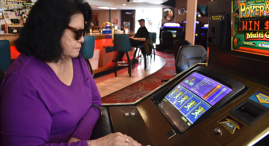 Lucille Brien plays a video poker machine at the Monte Bar and Casino in Billings, Montana, Tuesday, April 23, 2019. Montana, Iowa and Indiana are poised to be the first states to legalize sports betting this year, almost a year after the U.S. Supreme Court ended Nevada's monopoly. (AP Photo/Matthew Brown)