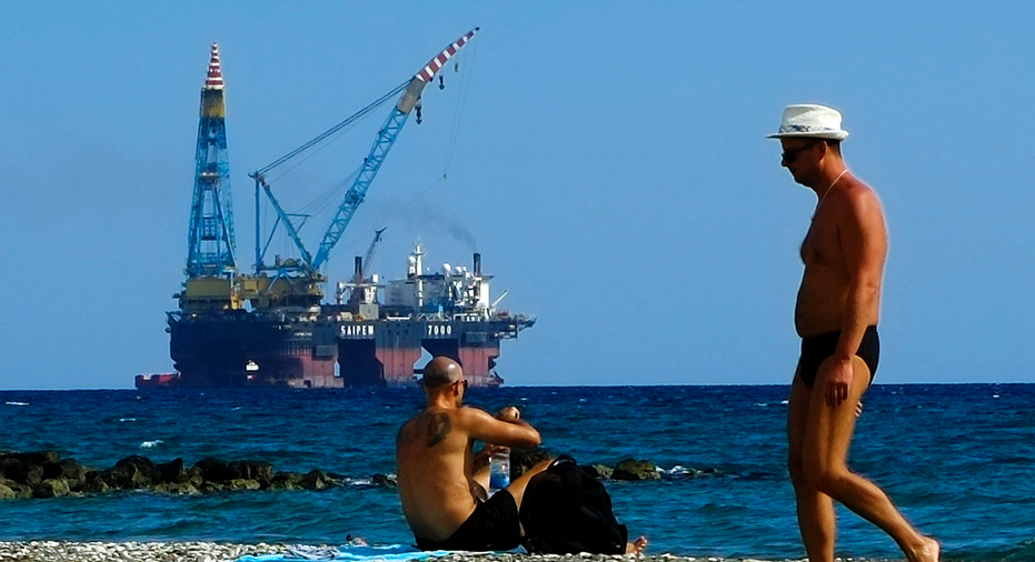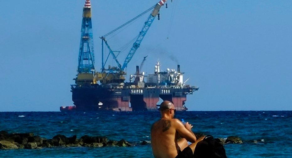 FILE - In this Sunday, Oct. 15, 2017 file photo, a man sits on a beach as a drilling platform is seen in the background outside from Larnaca port, in the eastern Mediterranean island of Cyprus. Cyprus' energy minister says ExxonMobil has discovered the third-biggest gas deposit in the world in the last two years. Announcing the results on Thursday, Feb. 28, 2019, of exploratory drilling, Energy Minister Georgios Lakkotrypis said the "world class" discovery offers proof of the potential for more hydrocarbon discoveries in waters off the east Mediterranean island nation that could become an alternative energy source for Europe. (AP Photo/Petros Karadjias, File)