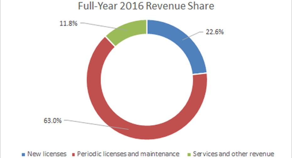 New software licenses only make up around 20% to 25% of total revenue. However, they are the key to future periodic licenses and maintenance and services growth.