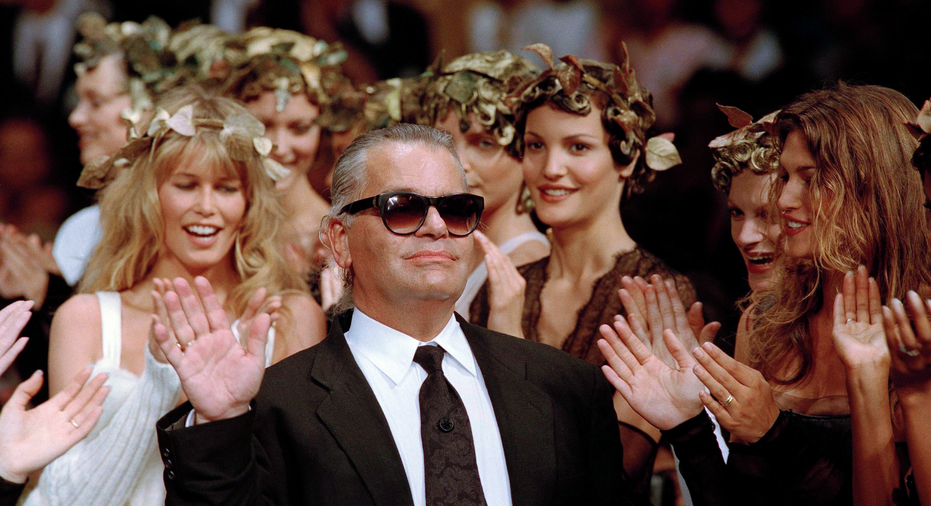 FILE - In this July 20, 1993 filer, German fashion designer Karl Lagerfeld acknowledges the applause of his models at the end of the show he designed for the French fashion house Chanel, for the 1993-94 Fall-Winter haute couture collection in Paris, July 20, 1993. At left background is German top model Claudia Schiffer. Chanel's iconic couturier, Karl Lagerfeld, whose accomplished designs as well as trademark white ponytail, high starched collars and dark enigmatic glasses dominated high fashion for the last 50 years, has died. He was around 85 years old. (AP Photo/Lionel Cironneau, File)