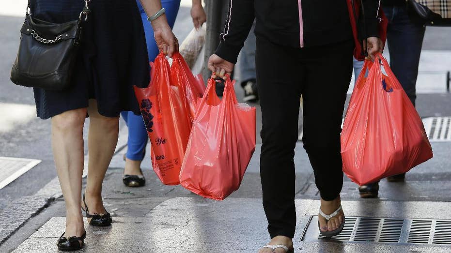 Women walk with plastic bags through Chinatown in San Francisco. California voters have narrowly approved a statewide ban on single-use plastic carryout bags. Proposition 67 was placed on the November 8, 2016, ballot by plastic bag industry supporter