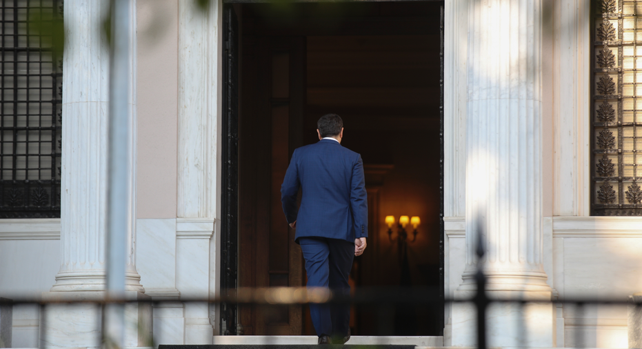 CORRECTING NAME OF PRESIDENT TO PROKOPIS PAVLOPOULOS - Greek Prime Minister Alexis Tsipras, enters his office after his meeting with Greek President Prokopis Pavlopoulos, in Athens, on Monday, June 10, 2019. Tsipras visited Greece's president to formally call for the dissolution of parliament and early elections on July 7, following his party's heavy defeat in European elections last month.(AP Photo/Petros Giannakouris)