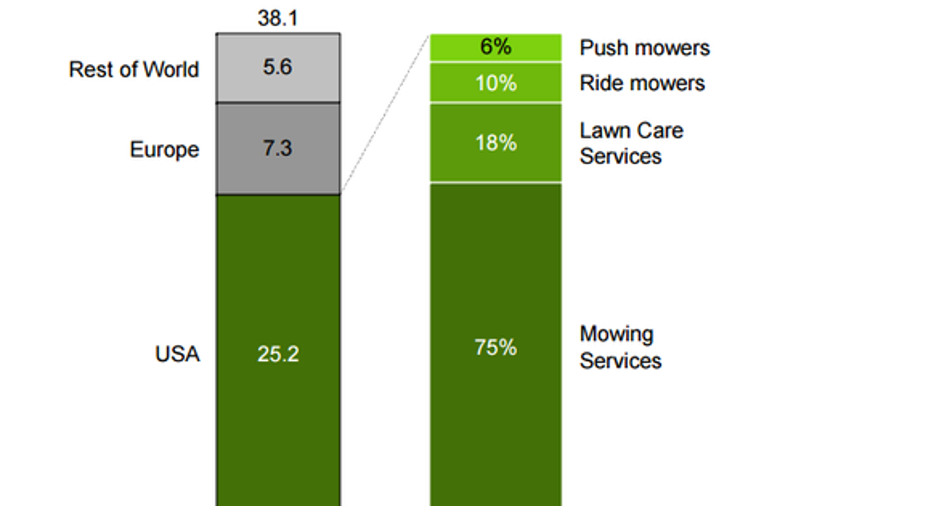Think (even) biggerBut things get even more exciting on a broader scale. According to iRobot, the annual retail value of the global lawn care market including lawn care and mowingservicesis just over $38 billion. Within that, the United States alone represents the vast majority at more than $25 billion: