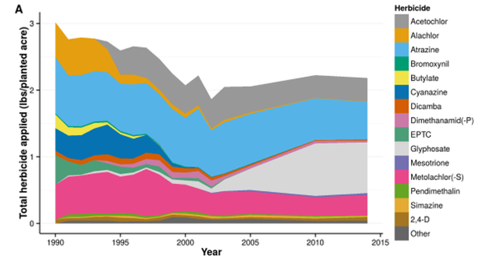 These trends are demonstrated by data compiled by the U.S. Department of Agriculture, which show that overall herbicide use per acre of corn planted has declined by 22% since 1990 and held relatively constant since. It's important to note that farmers often apply more than one herbicide to their crops.