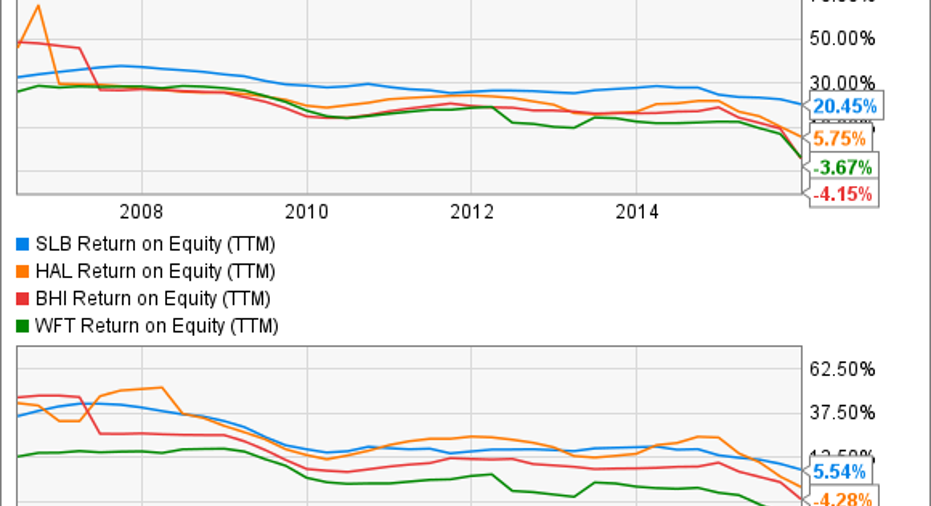 Using this as our baseline, then Schlumberger continues to be the best investment in the oil services space. That also makes it the least risky. Unlike peers Halliburton and Baker Hughes , which are pretty highly concentrated on the North American market and shale, Schlumberger's revenue stream is much more diversified internationally and has a much larger market share in deepwater. These positions and Schlumberger's history of good capital allocation have led to the company generating superior margins and more consistent returns on equity.