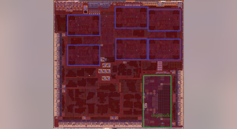 Chipworks' Dick James tells me that he sees a 12-cluster GPU, two CPU cores, and an absence of the level-three cache memory found inside the A9 chip (I'll explain why I think Apple didn't include it later in this article). I agree with his assessment. The two CPU cores can be seen in the green box, and I believe that inside of each blue box are two GPU clusters, for a total of 12 clusters.