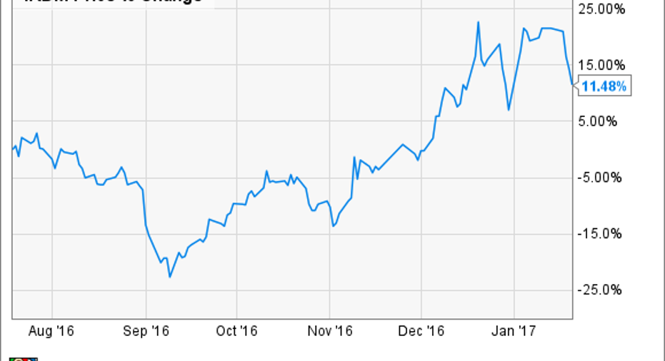 Iridium Communications' (NASDAQ: IRDM) stock rose by as much as 35% in the weeks following the presidential election and is now up about 25% from where it was before the election of Donald Trump. While initial investor exuberance over potential Trump-fueled spending that could benefit the company may have gotten the party started, the real reason for the rise in share prices is more likely that the company's new satellite array is finally launching. Iridium's stock is up roughly 11% over the past six months or so.