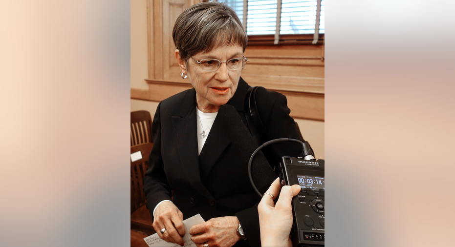 In this photo from Tuesday, Dec. 4, 2018, Kansas Gov.-elect Laura Kelly answer questions from reporters during a break in a legislative meeting at the Statehouse in Topeka, Kan. Kelly, a Democrat, races a push in the Republican-controlled Legislature to cut state income taxes to offset a revenue windfall caused by changes in federal tax laws at the end of 2017. (AP Photo/John Hanna)