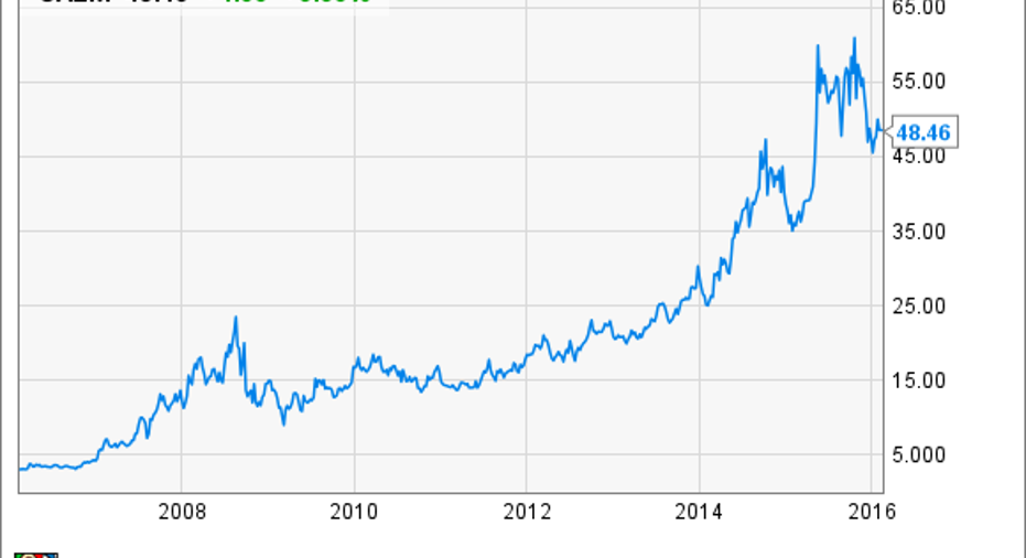 In addition, Cal-Maine delivers strong profit margins and a dividend yield above 6%, and its stock has been a historically strong performer. As the chart below shows, the stock is up more than 1,000% in the last ten years.
