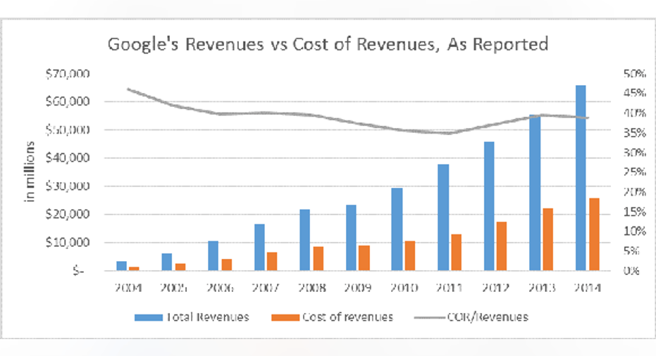 I thought it would be a revealing exercise to net out TAC from both revenues and cost of revenues. For example, Google reported revenues of $66 billion last year and cost of revenues of $26 billion. If we take out $10 billion of TAC from both figures, we have revenues of $56 billion and costs of $16 billion. Note that the TAC figure I've used is only network-member TAC and not distribution TAC, which is a different matter. But more on that later.