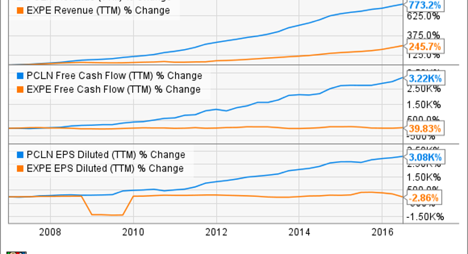 Priceline is not just a promising growth story; the company has proven its ability to deliver over time. The following chart shows revenue, free cash flow, and earnings per share for Priceline and Expedia over the last decade. A picture is worth a thousand words, and Priceline has produced impressive financial performance while leaving its main competitor in the dust.