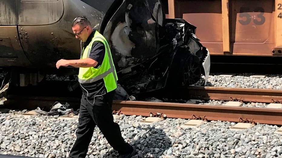 Police investigate the scene of a collision between a Brightline train and a car in Oakland Park, Fla. Florida higher-speed passenger train service tied to Richard Branson’s Virgin Group has the worst per-mile death rate in the U.S.(Wayne Roustan/Sou