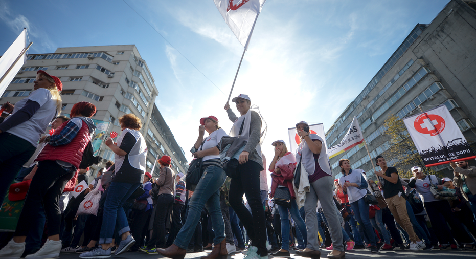 BUCHAREST, Romania – Some 7,000 Romanian public sector health workers demonstrated Thursday, demanding that the government eliminate a plan to make them pay more social security taxes.