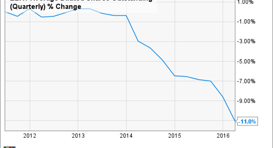 A considerable portion of eBay's free cash flow is allocated to share buybacks. The company repurchased stock for $2.15 billion in 2015, and management assigned $1 billion to buybacks during the first quarter of 2014. eBay has been actively buying back its shares since 2014, and this has reduced shares outstanding by a meaningful 11%.