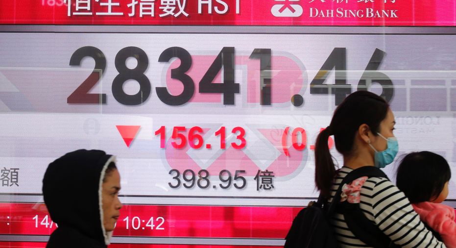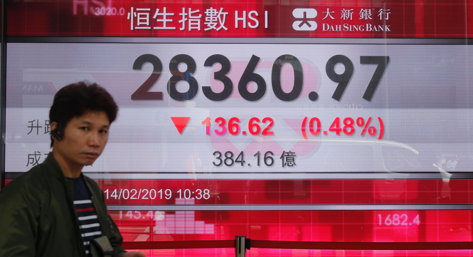People walk past an electronic board showing Hong Kong share index outside a bank in Hong Kong, Thursday, Feb. 14, 2019. Asian stocks were mostly lower on Thursday as China and the U.S. kicked off two days of trade negotiations in Beijing. (AP Photo/Kin Cheung)